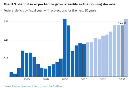 CBO 数据显示,2026 年预计赤字较 2025 年 1 月发布的上一年度预测高出8%。未来 10 年累计赤字预计较去年预测高出6%,不过该报告假设政策保持不变。